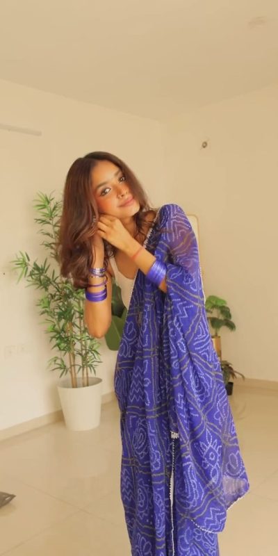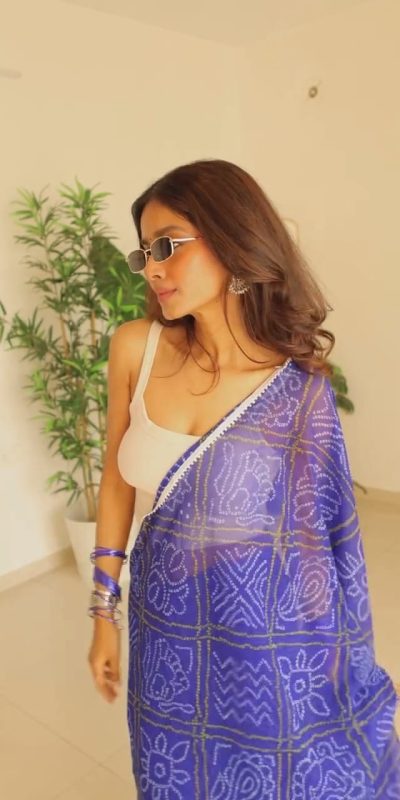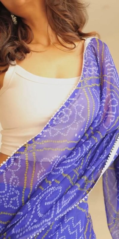| Fabrics | Saree Fabric : Pure Soft Georgette Silk Design : Bandhani design on all over the body and pallu design with lace border work Ready To Wear saree color combination All over the body Blouse :White color banglory silk running unstitched blouse piece |