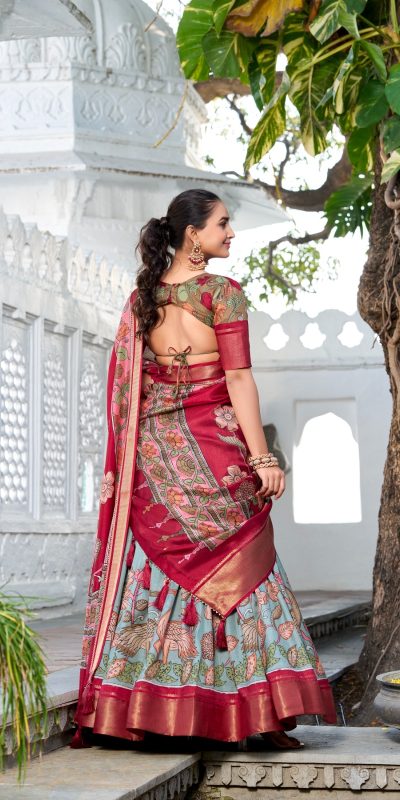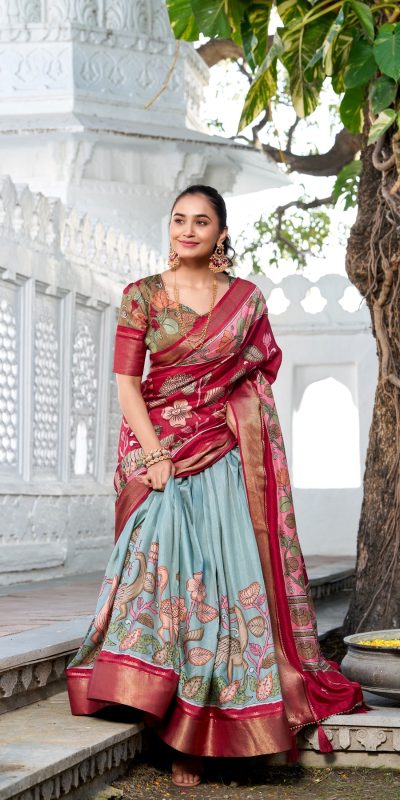 Lehenga: Dole Silk Inner Micro Cotton Work :Printed Kalamkari With Zari Weaving Border Length : 42+ Inch Type : Semi Stitched (Free Size)Waist : Supported Up To 42 Lehenga Stitching : Stitch With Canvas Lehenga Closer : Drawstring With Zip Length : 41Flair : 3.80 MeterBlouse : Dole Silk Jacquard Silk Work :Printed Kalamkari With Zari Weaving Border Sleeves : Half Sleeves Type : Un-StitchedBlouse Length : 0.80 MeterDupatta : Dola Silk Jacquard SilkDupatta work : Kalamkari Print With Zari Weaving Border Also Comes With Both Side Tassels Length : 2.4 Meter |