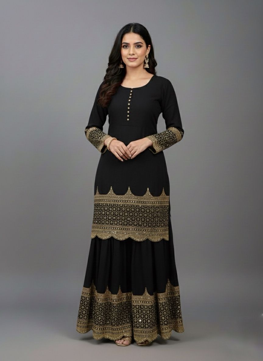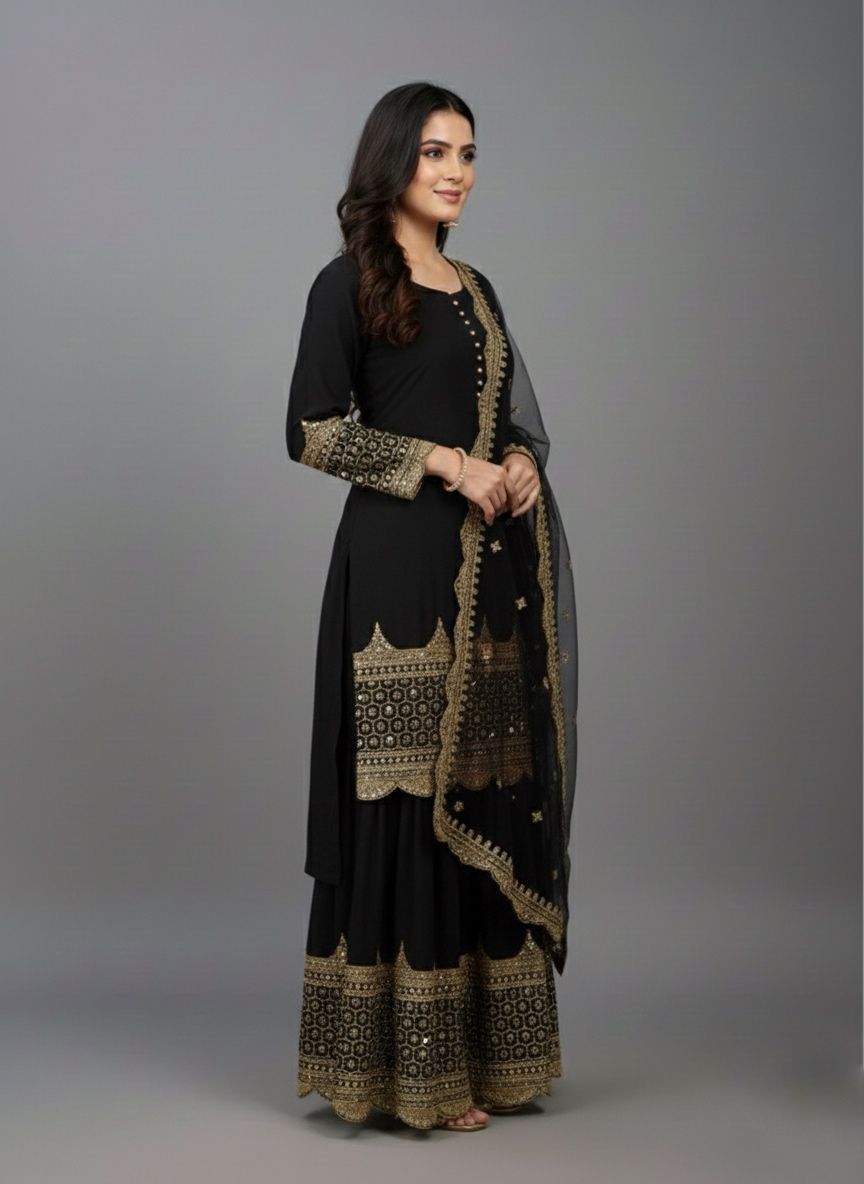 ZF 250 Black Color Faux Georgette Embroidery Sequence Work Sharara Suit Wedding, Party, Festive, Events Etc. Expected Delivery 4-6 Working Days @2099/- | Jump Suits, Salwar suit, Casual Suits, Creative suits, Designer Suits, Palazzo Suits, Party Wear Suits, Patiala Suits, Straight Suits