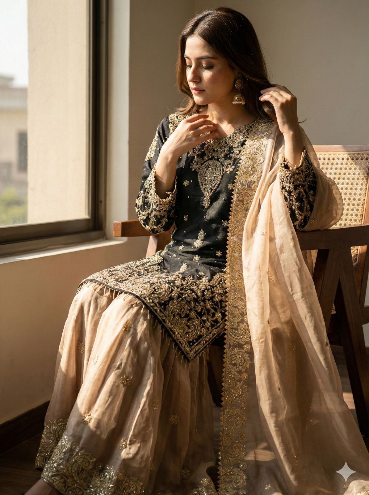 Black Zimmy Choo Silk Embroidery Work Slwar Suit