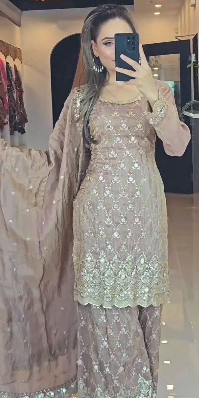 | Fabrics | Top Fabric :Pure Heavy Chinnon Silk With Heavy Embroidery Sequence Work with Real Mirror Hand Work With Full Sleeve Top Inner : Heavy Micro Cotton Top Size : Free Size Fully Stitched Ready To Wear Top Length : 38-39 Inch Palazzo Fabrics : Pure Heavy Chinnon Silk With Embroidery Sequence Work With Real Mirror Hand Work Full stitched Pent Length:40-41 Inch Dupatta Length: 2.10 MTR |