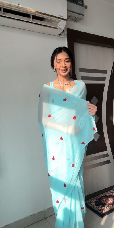 Classic Sky Blue soft Georgette silk with embroidery red color heart design Saree