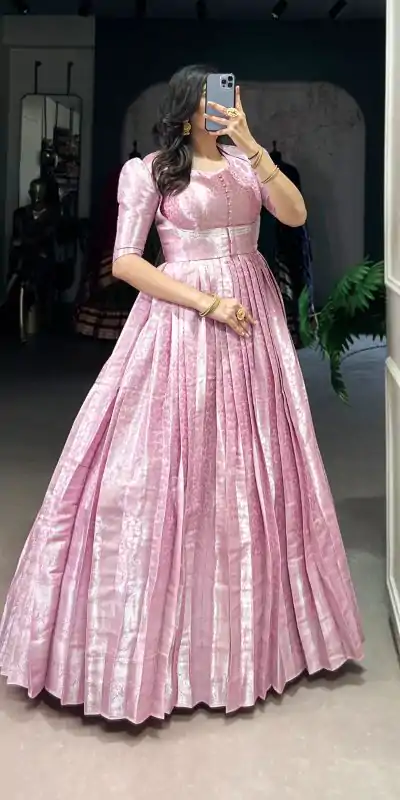 | Fabrics | Gown Fabric : Kanjivaram Gown Work : Zari Weaving Work With Lace Touch Up Gown Chest Size : Free Size Semi Stitched(Inside 2 inch extra margin available so customer can adjust up to 38″ to 42″ for your body comfort) Gown Waist Size : 38 Gown Shoulder :15 Gown Length : 55 Gown Flair : 3.80 Meter Gown Lining : Micro Cotton Koti Fabric : Kanjivaram |