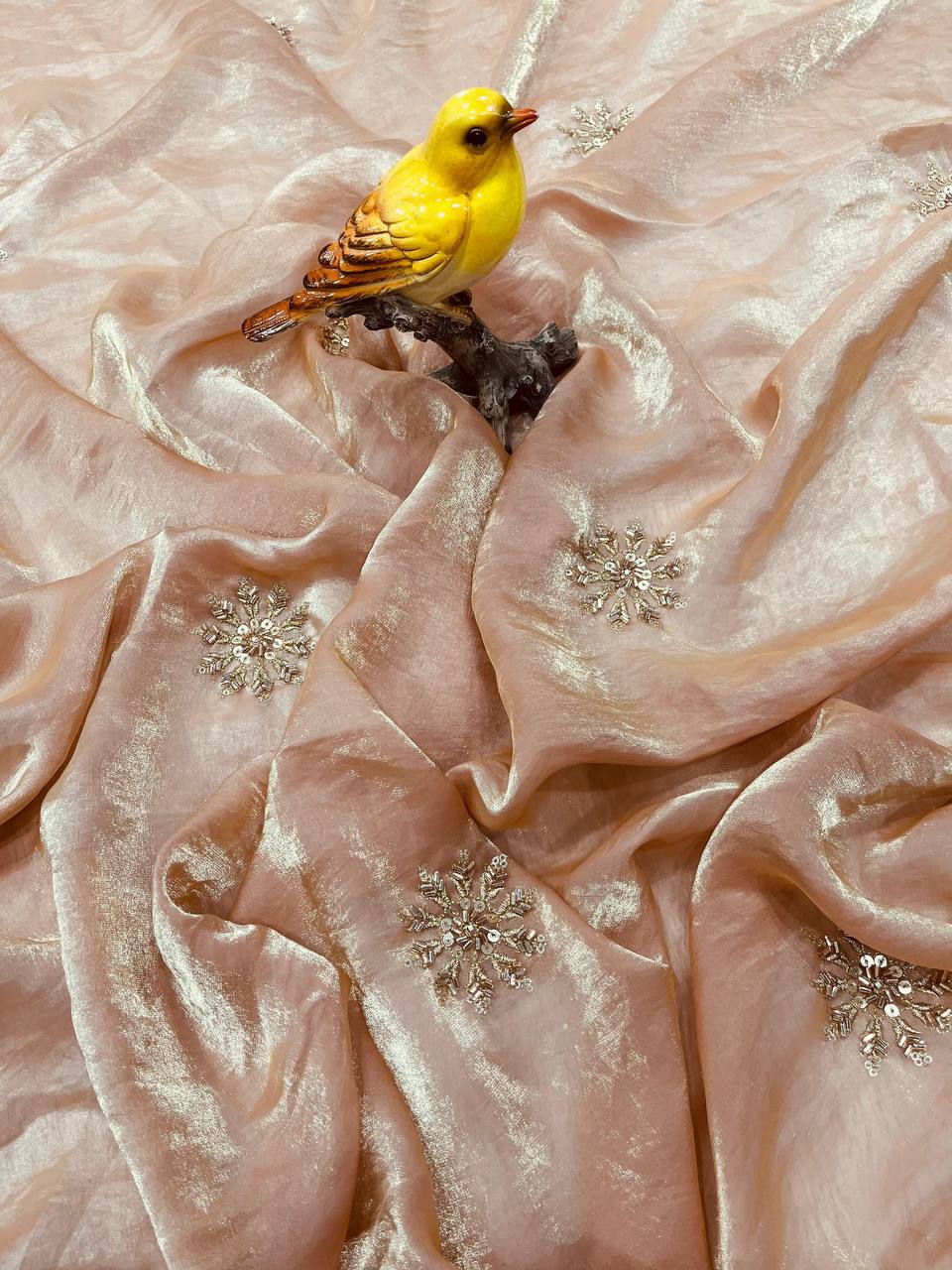 Cream Fandy Satin Silk Bead Work Saree