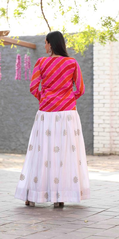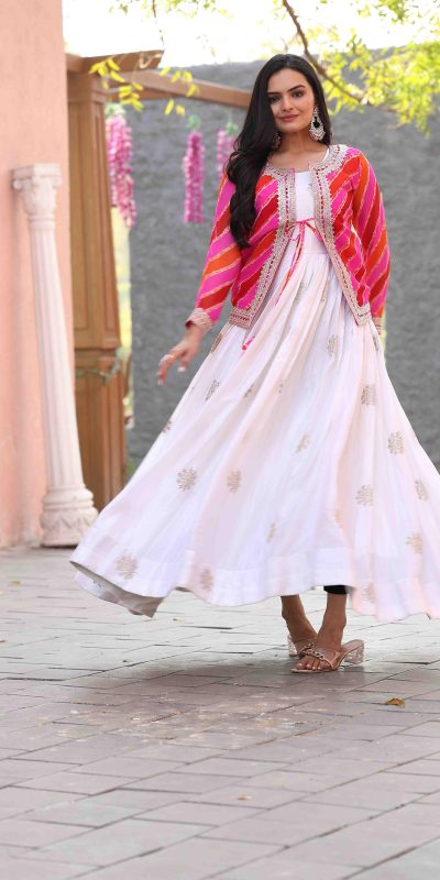 Fabrics Fabric :  pure chinon Inner : Micro Cotton Work : cording 3mm sequence Embroidery work Stitch : Free Size Semi Stitched Size : Free Size Semi Stitched Jacket Fabric : Pure leheriya Inner:-Micro Cotton Work : cording 3mm sequence Embroidery work Size: M up to L margin XL up to 2xl margin