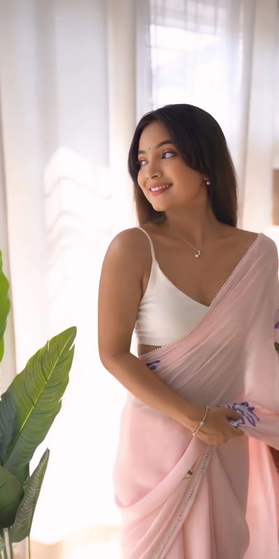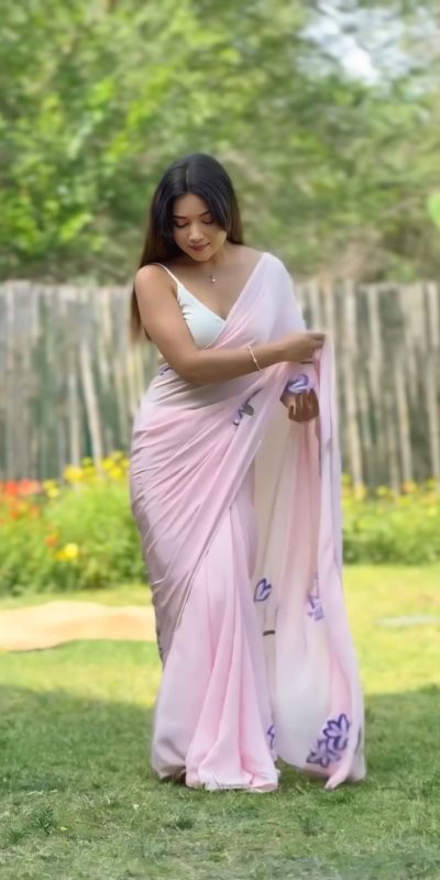 | Fabrics | Saree Fabric : Pure Soft Georgette Silk Design : flower design on all over the body and pallu design with lace border with pari work. Ready To Wear Saree color combination All over the body Blouse : Same model white color banglory silk running unstitched blouse piece |