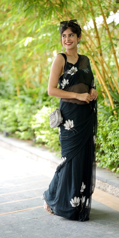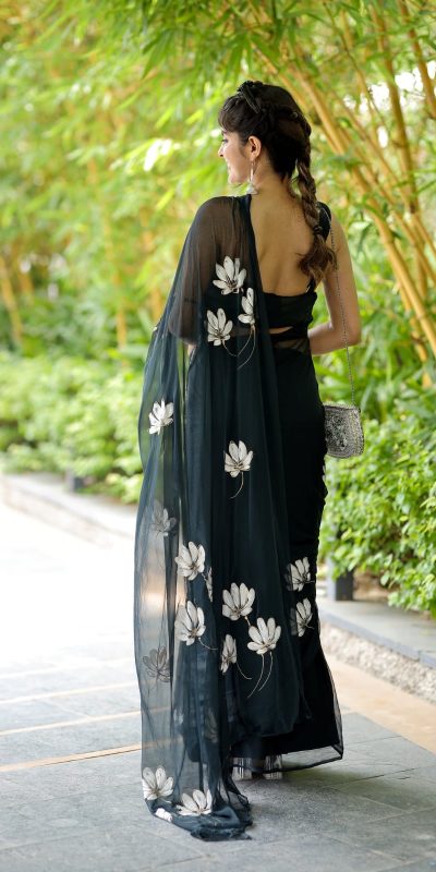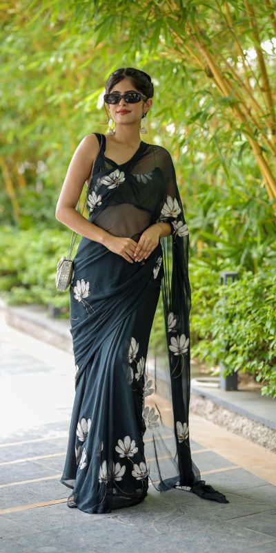 Fabrics Saree Fabric : Pure Soft Georgette Silk Design : flower design on all over the body and pallu Ready To Wear saree beautiful color combination All over the body Blouse : black color banglory silk running unstitched blouse piece