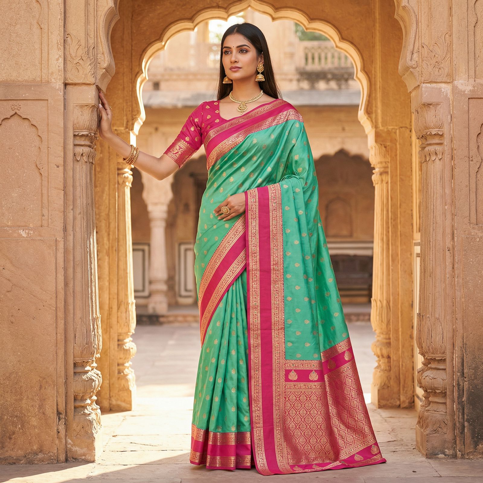 Firozi Banarasi Gold Zari Work Saree