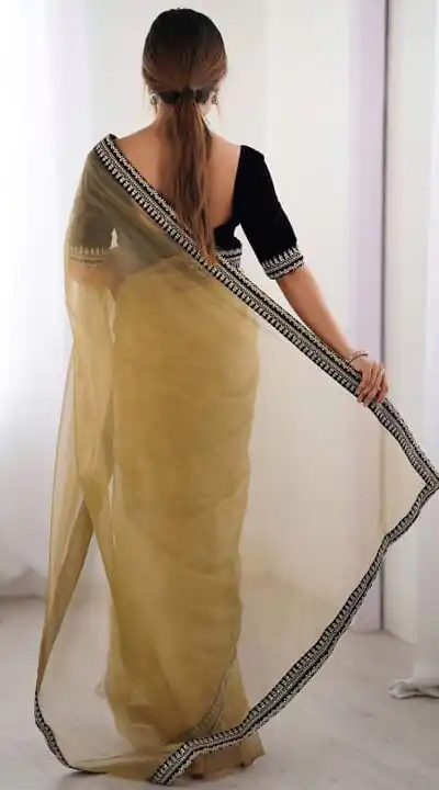 Gold Soft Twil Net Silk Embroidery Work Saree