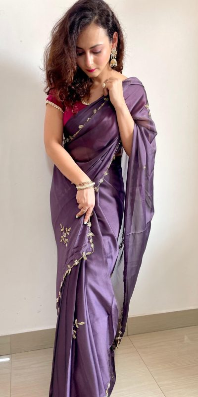 Violet Rangoli Silk Handwork Cutwork Pearl Saree