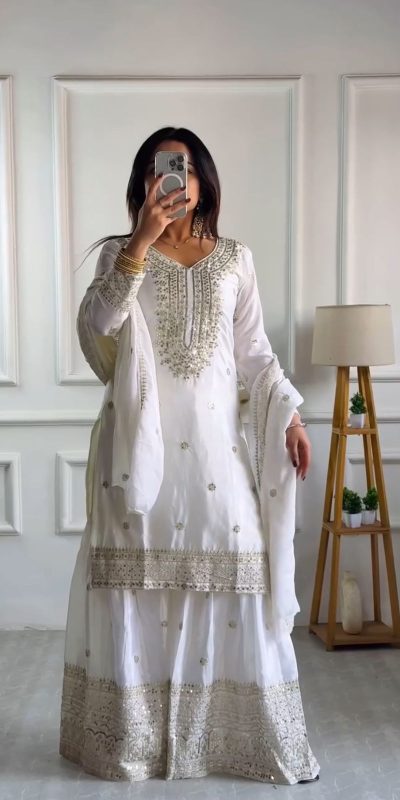 White Chinnon Silk With Embroidery Work Sharara Suit
