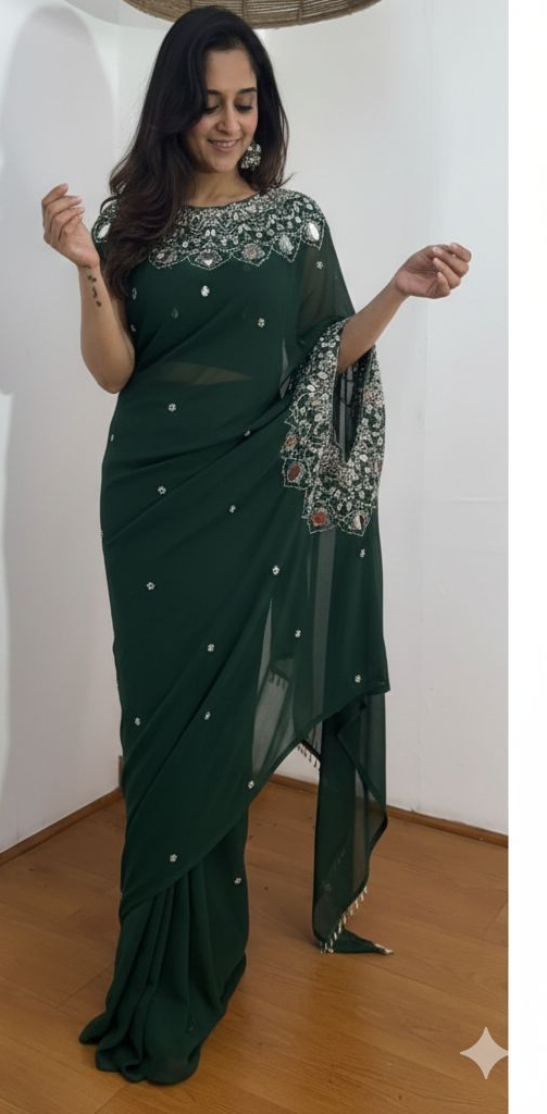 Work:- Embroidery Work With Real Mirror & Pearls Hand Work / 5.5 Meter Drape Pattern