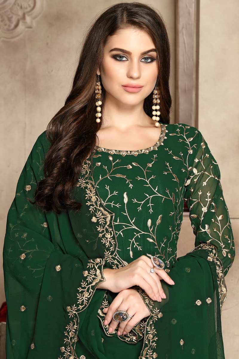 | Fabrics | Gown : Heavy Fox Georgette Sleeves :- Heavy Fox Georgette INNER Attached Santoon Length :- Max Up to 55” Bottom :- Heavy Santoon Silk Dupatta :- Heavy Fox Georgette Work :- Multi Thread & Jari Embroidered Stich Work Type :- Semi Stitched Material) |