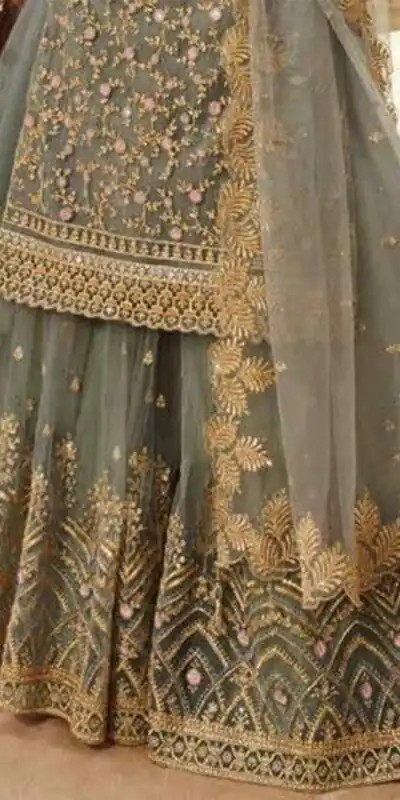 Top :- soft net Embroidery work Sequence Sleeves :- soft net Embroidery Work Inner: santun ( Attached with top )Size Detail: Top Length :- Max up to 44 Inch Top Bust Size : Free Size Semi StitchedBottom length max up to 44 inchBottom :- Santoon Dupatta: 2.25 Meter Type :- Semi Stitched Suit Dupatta :- soft net +embroidery work Side Lace Border |