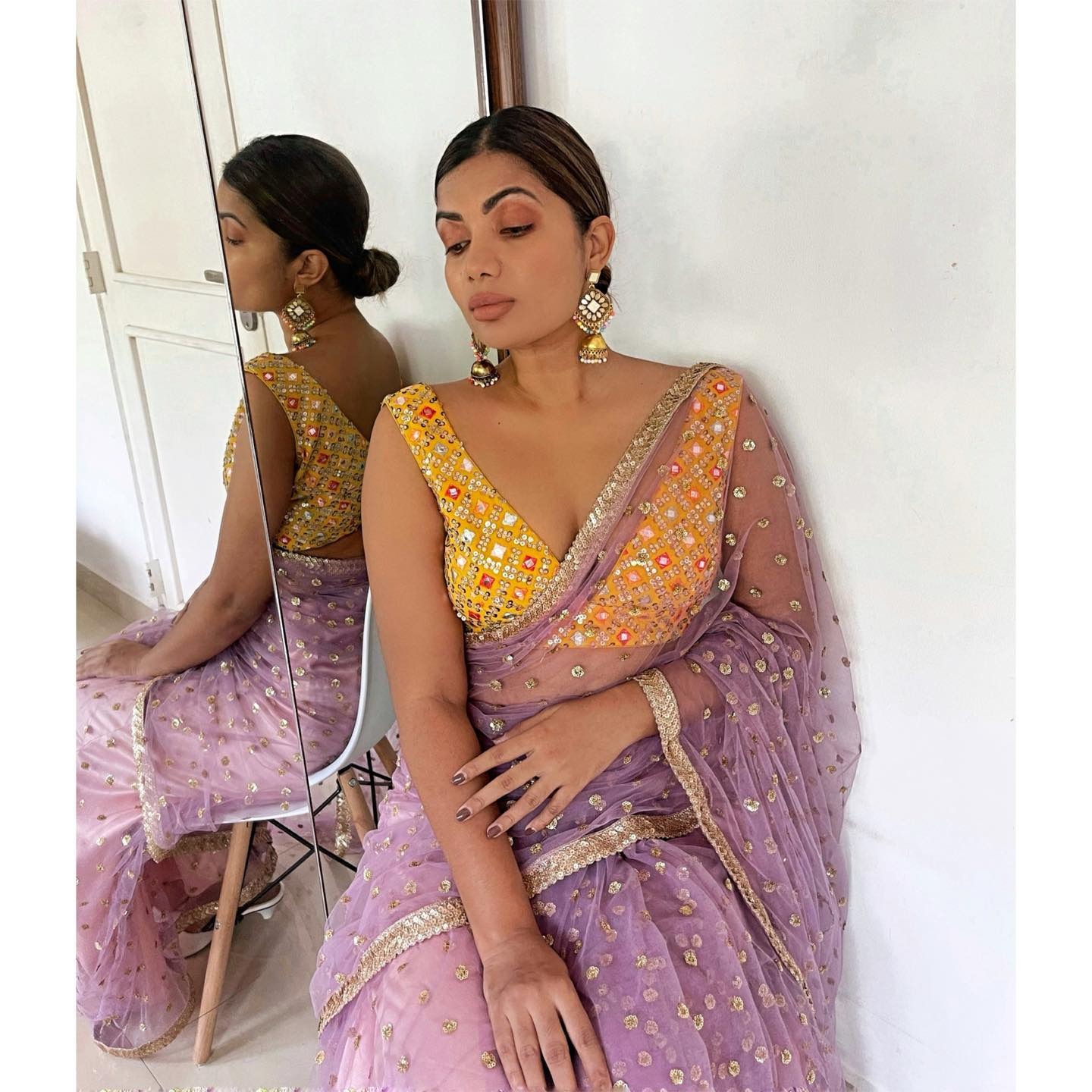 Bought this subtle grey saree for office parties; understated shimmer, minimal prints, and it transitions easily from conference room to dinner with colleagues.