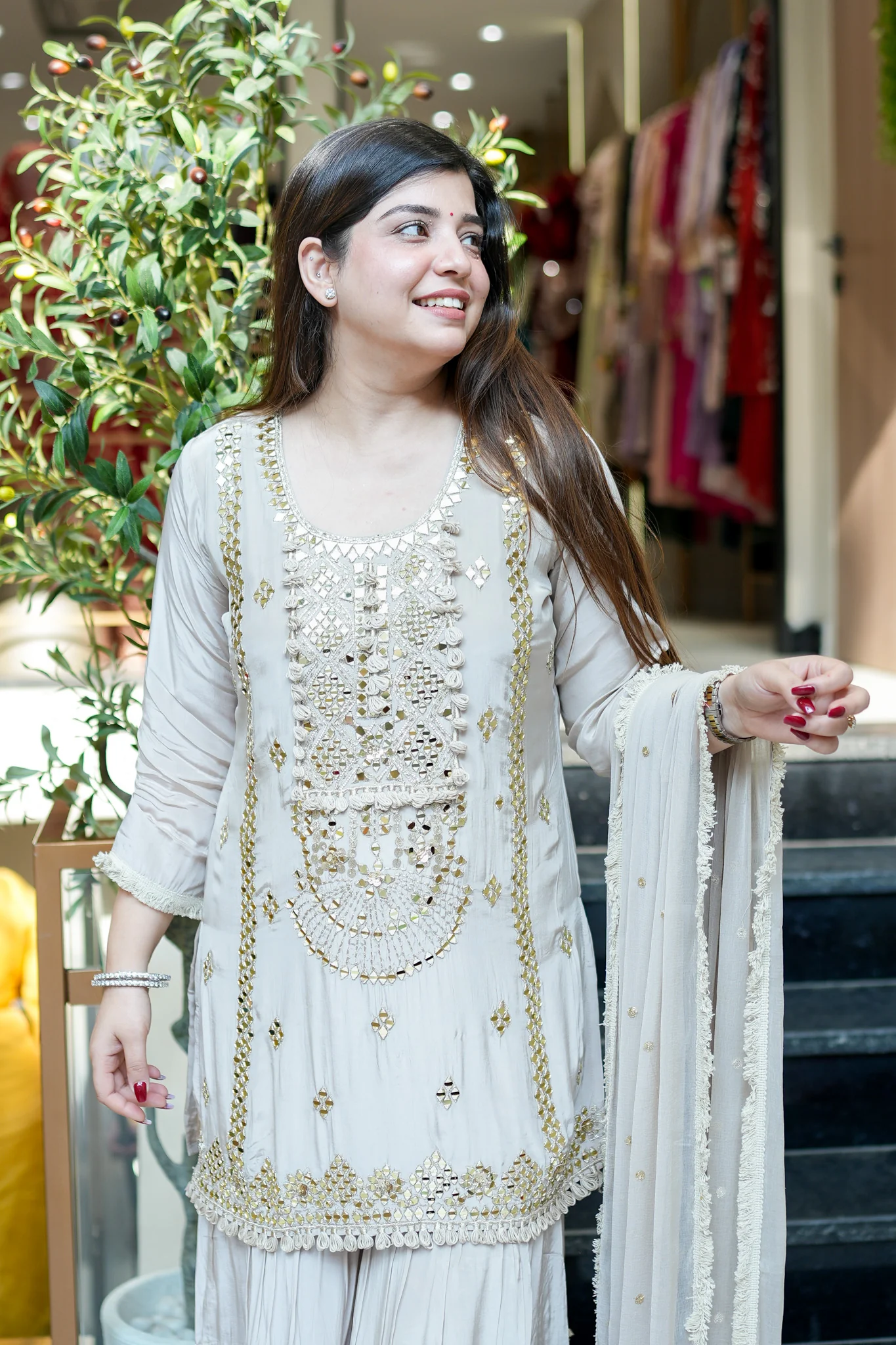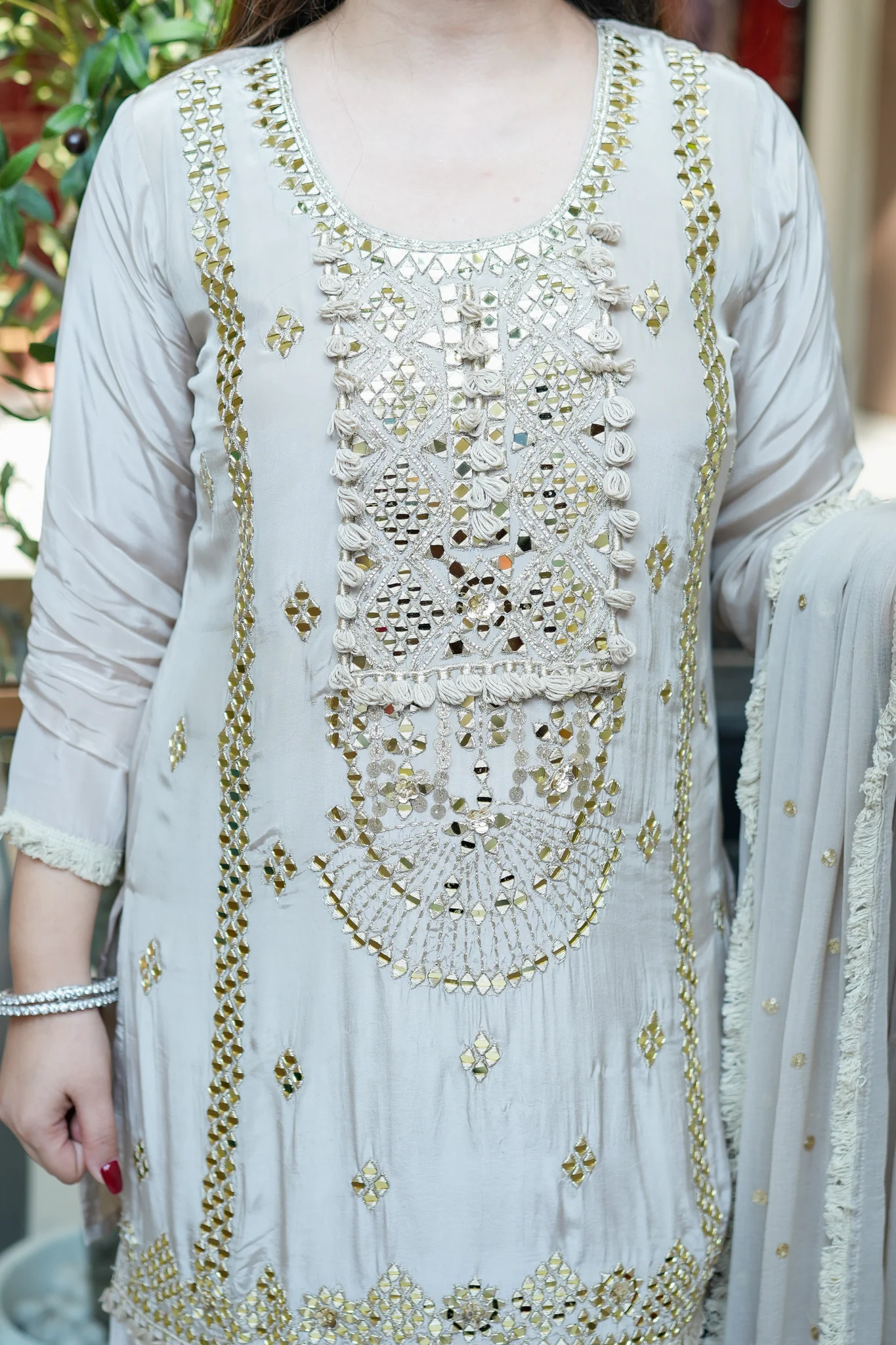 Off White Korean Satin Silk Embroidery Work Salwar Suit