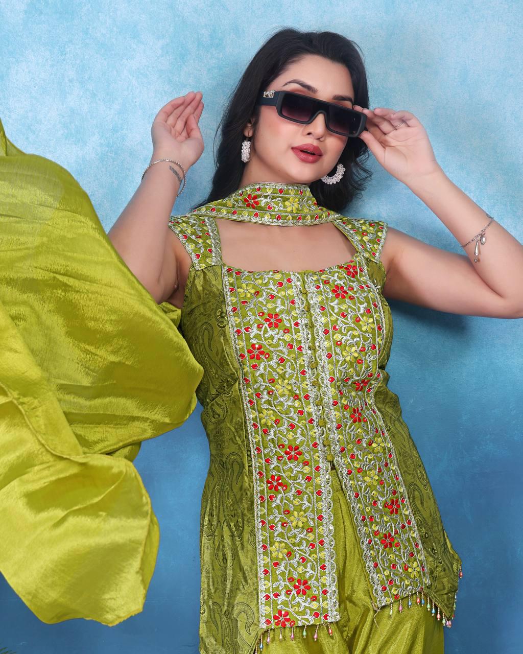 Lime Yellow Chinon With Sequins Work Salwar Suit