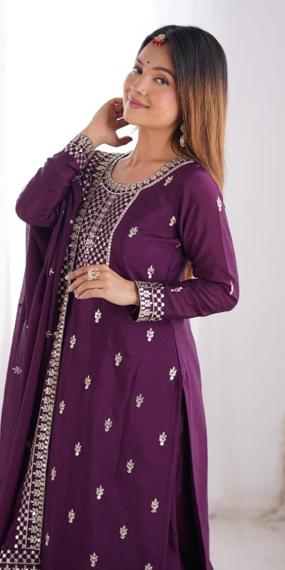 Wine Chinon Silk Embroidery Jari Work Salwar Suit