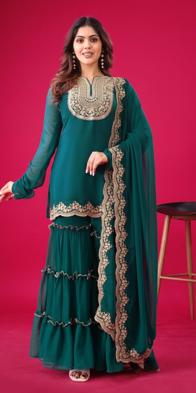 | Fabrics | Top Fabric :Blooming Faux Georgette With Heavy Embroidery 3mm Sequence Thread Work With Full Sleeve Top Inner : Heavy Micro Cotton Top Size : Free Size Fully Stitched Ready To Wear Top Length : 31-32 inchPalazzo Fabrics : Blooming Faux Georgette With Elastic Full stitched Palazzo inner : Heavy Micro Cotton Length: 40-41 Inch fully stitched Dupatta Fabric : Blooming Faux Georgette With Embroidery 3mm Sequence Work With Lace Border |
