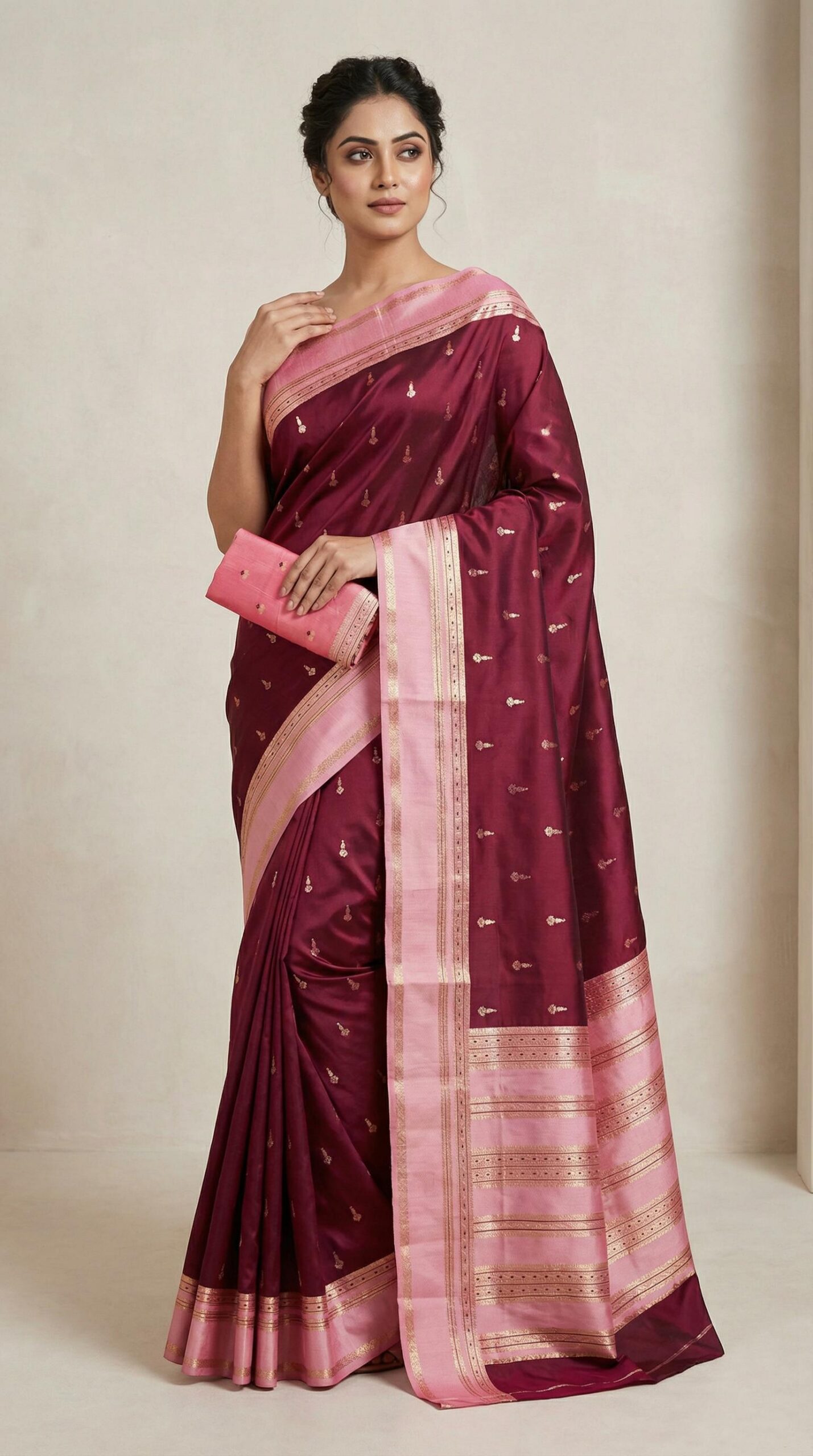 gold zari butta motifs across the body. The saree pallu zari weaving classic paisley and floral motifs.