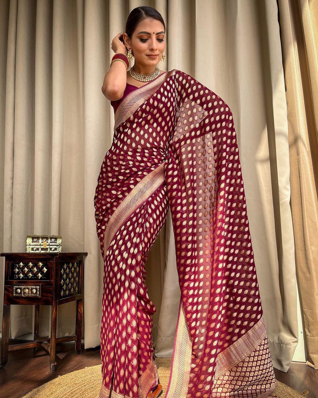 A perfect choice for traditional gatherings. The saree has a rich texture, smooth finish, and stunning colors that instantly brighten your look.
