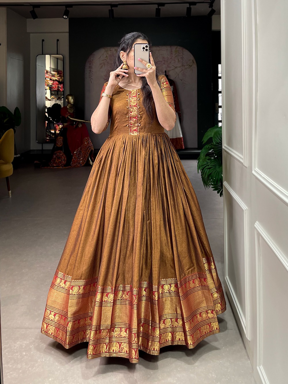 YNF 5316 Mustard Color Narayan pet (cotton) Zari weaving work Gown Casual, Wedding, Festive, Events . Expected Delivery  4-6 Working Days @1799/- only      | Gowns, Bollywood Gowns, Creative Gowns, Designer Gowns, Embroidered Gowns, Party Wear Gowns