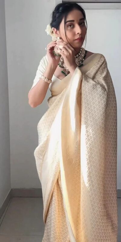 Off White Soft Lichi Silk Golden Waving Saree