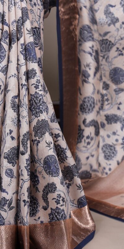 Off White Tasar Silk With Printed Viscose Border Saree