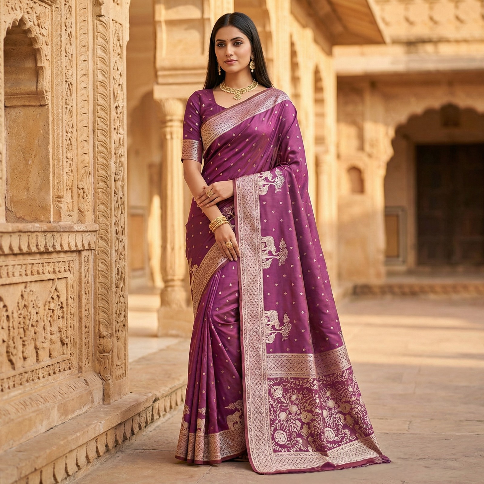 Saree :-  all-over self weaving with delicate zari motifs. Enhanced with a contrasted rich pallu and an elegant unique border adorned with heavy zari weaving,