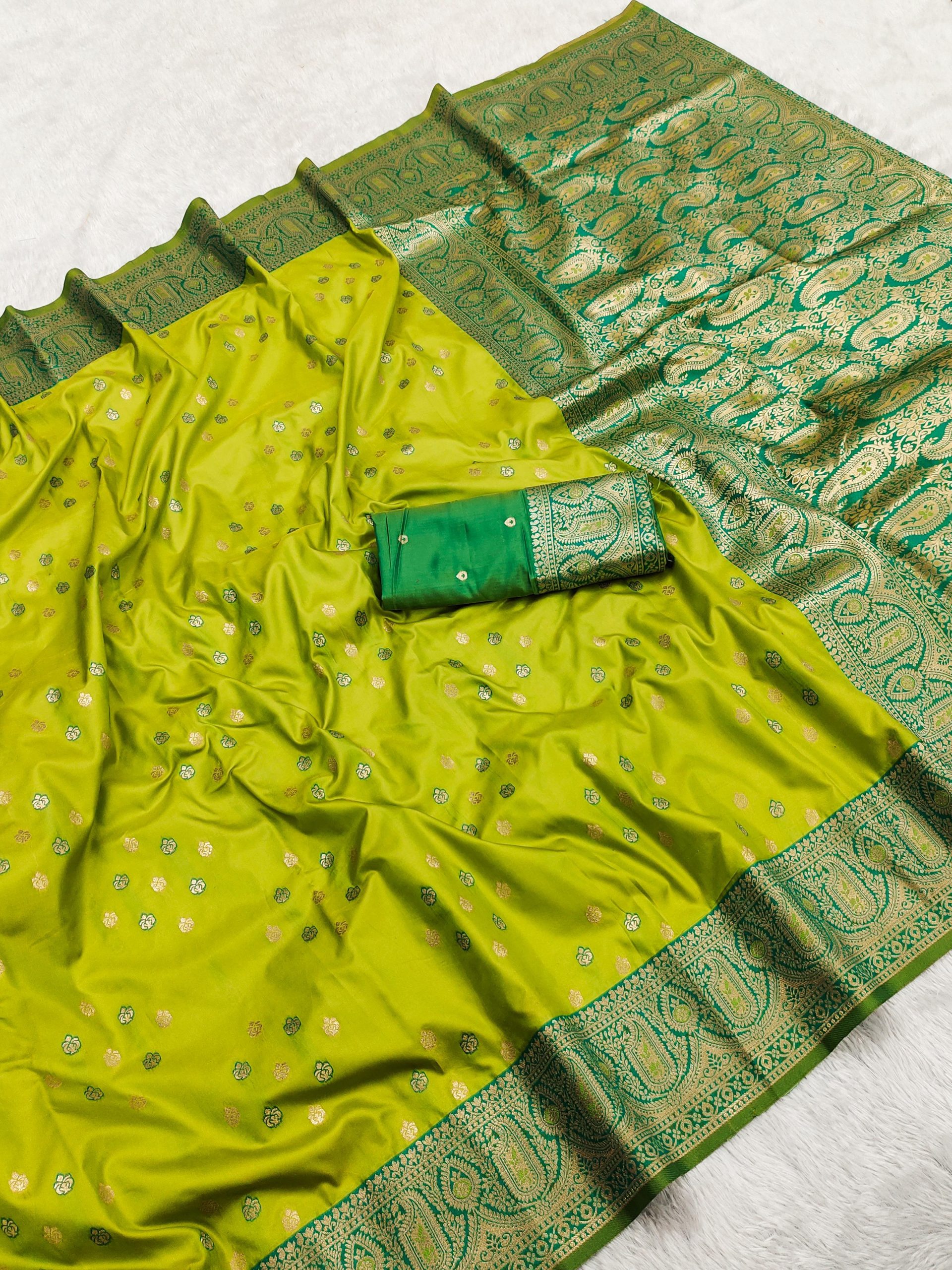 Saree :- Rich Banarasi silk saree with golden butta motifs, complemented by an intricate and gold zari border and pallu featuring paisley designs.