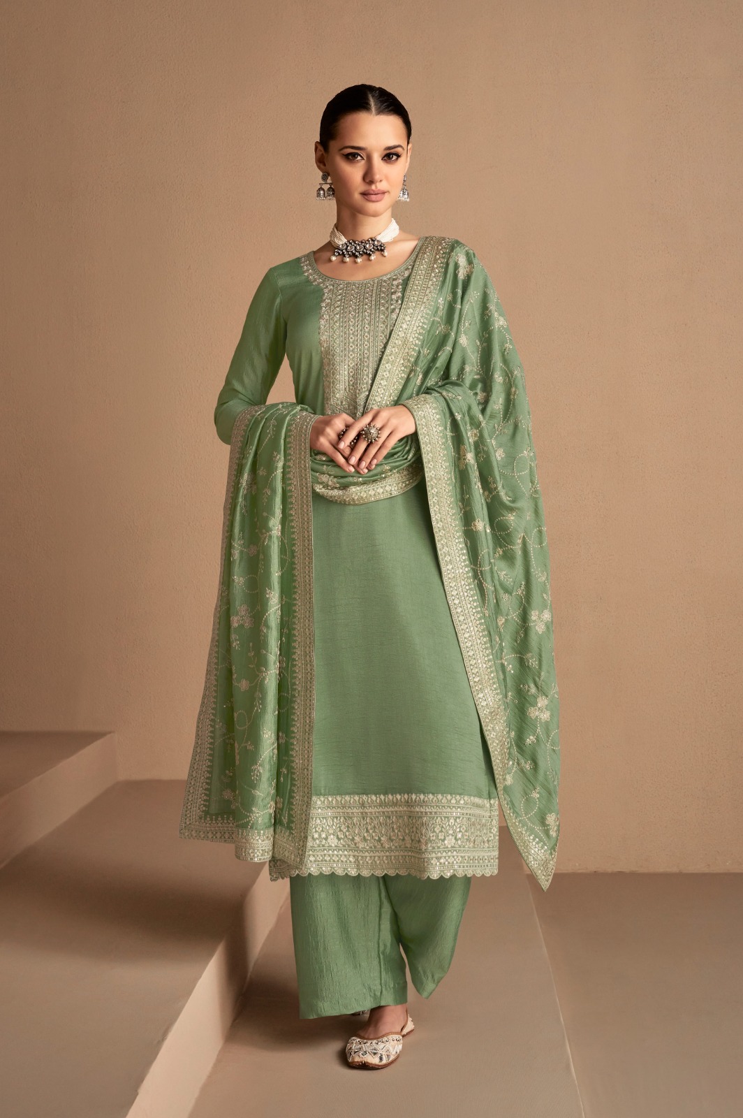 Pista Vichitra Embroidery Stone Work Salwar Suit
