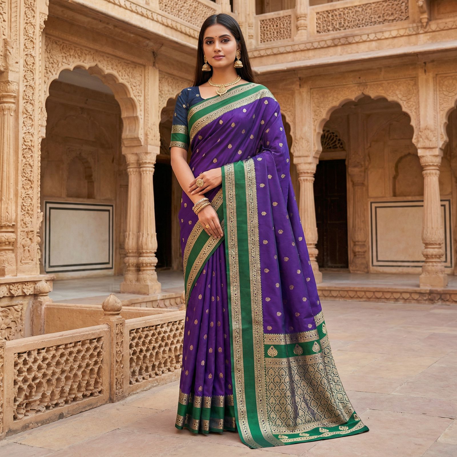 Blouse :- Contrast Matching silk weaving blouse piece with zari motifs and coordinated border for a complete traditional look.
