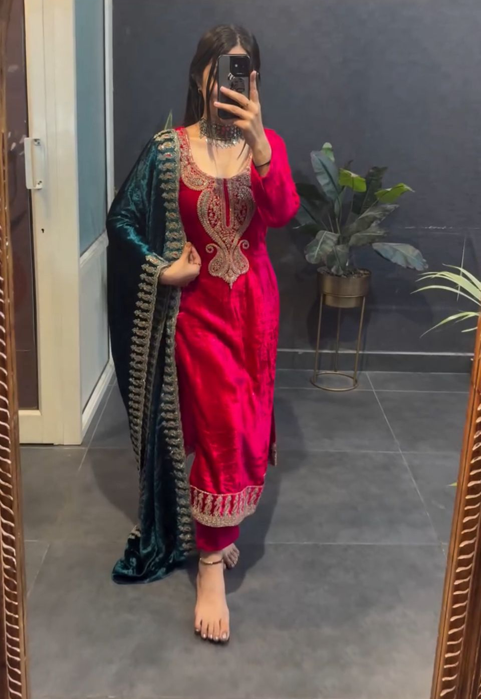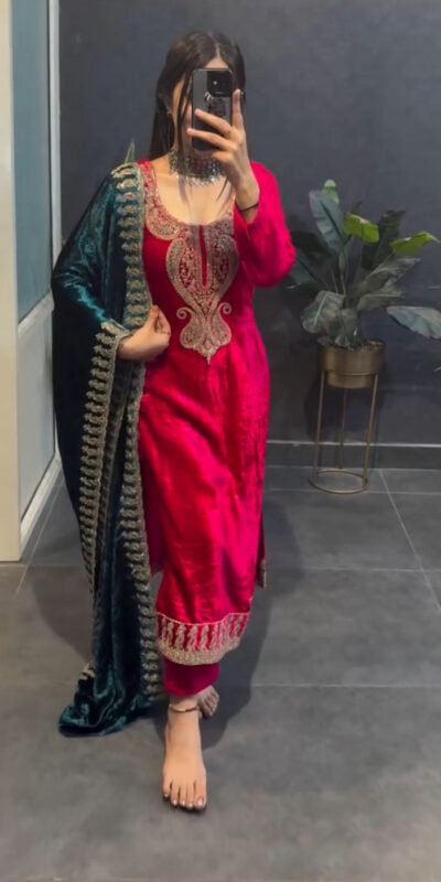 Red Viscose Velvet Lace Embroidery Work Salwar Suit