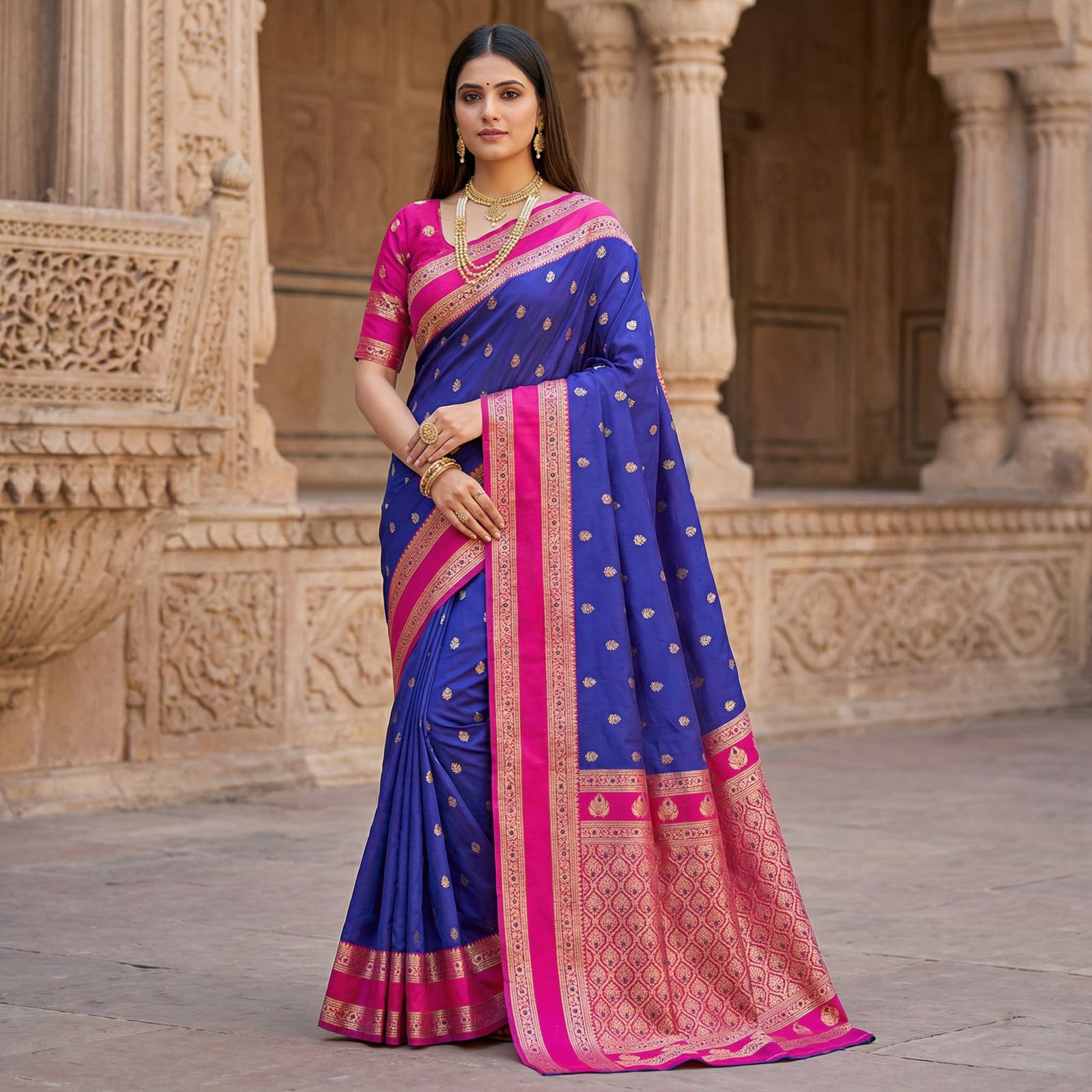 Blouse :- Contrast Matching silk weaving blouse piece with zari motifs and coordinated border for a complete traditional look.
