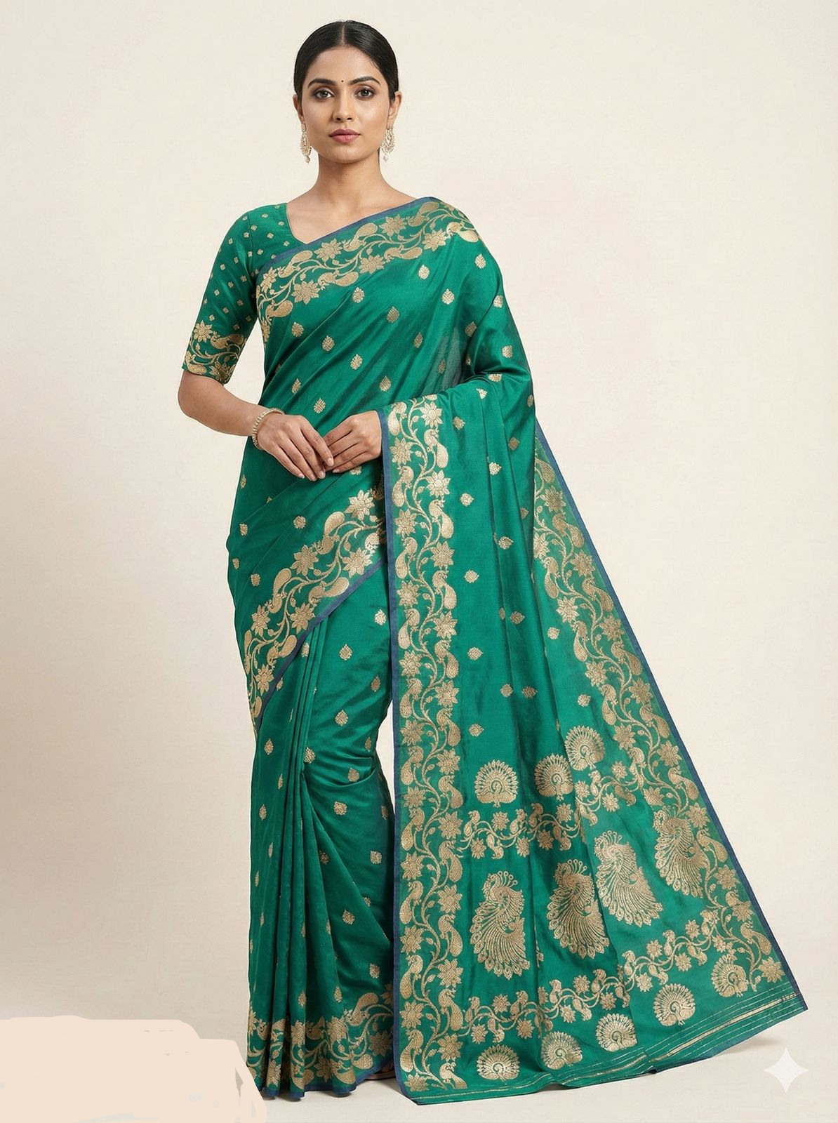 Blouse :-  Matching soft pure silk weaving blouse piece with subtle zari motifs and a coordinated rich border for a complete graceful look.