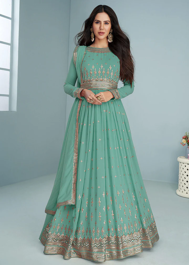 FC 9293 Sea Green Georgette Salwar Suit with Embroidery Work. Wedding, Party, Festive, Events, Now at just ₹2649. Delivery 4-6 Working Days. Shop now. | Jump Suits, Salwar suit, Casual Suits, Creative suits, Designer Suits, Palazzo Suits, Party Wear Suits, Patiala Suits, Straight Suits