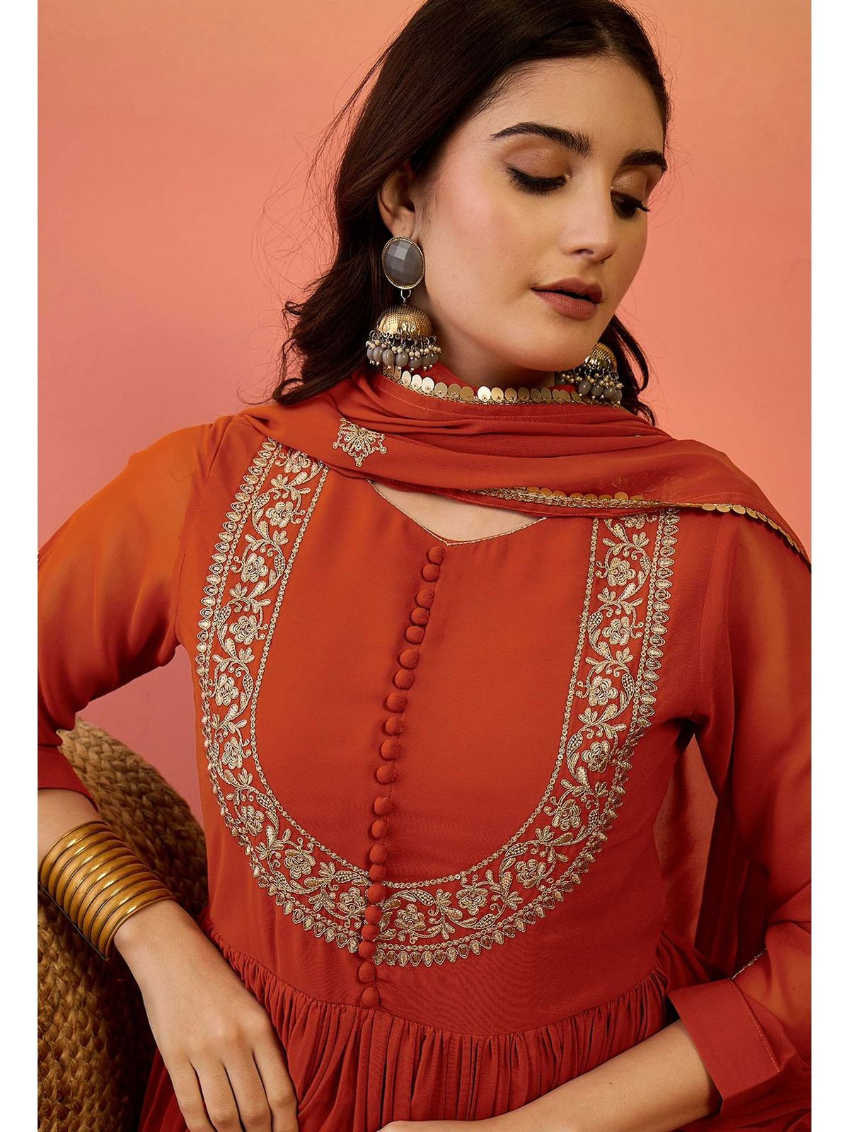 Superb Rust Fox Blooming Georgette Lace Work Gown