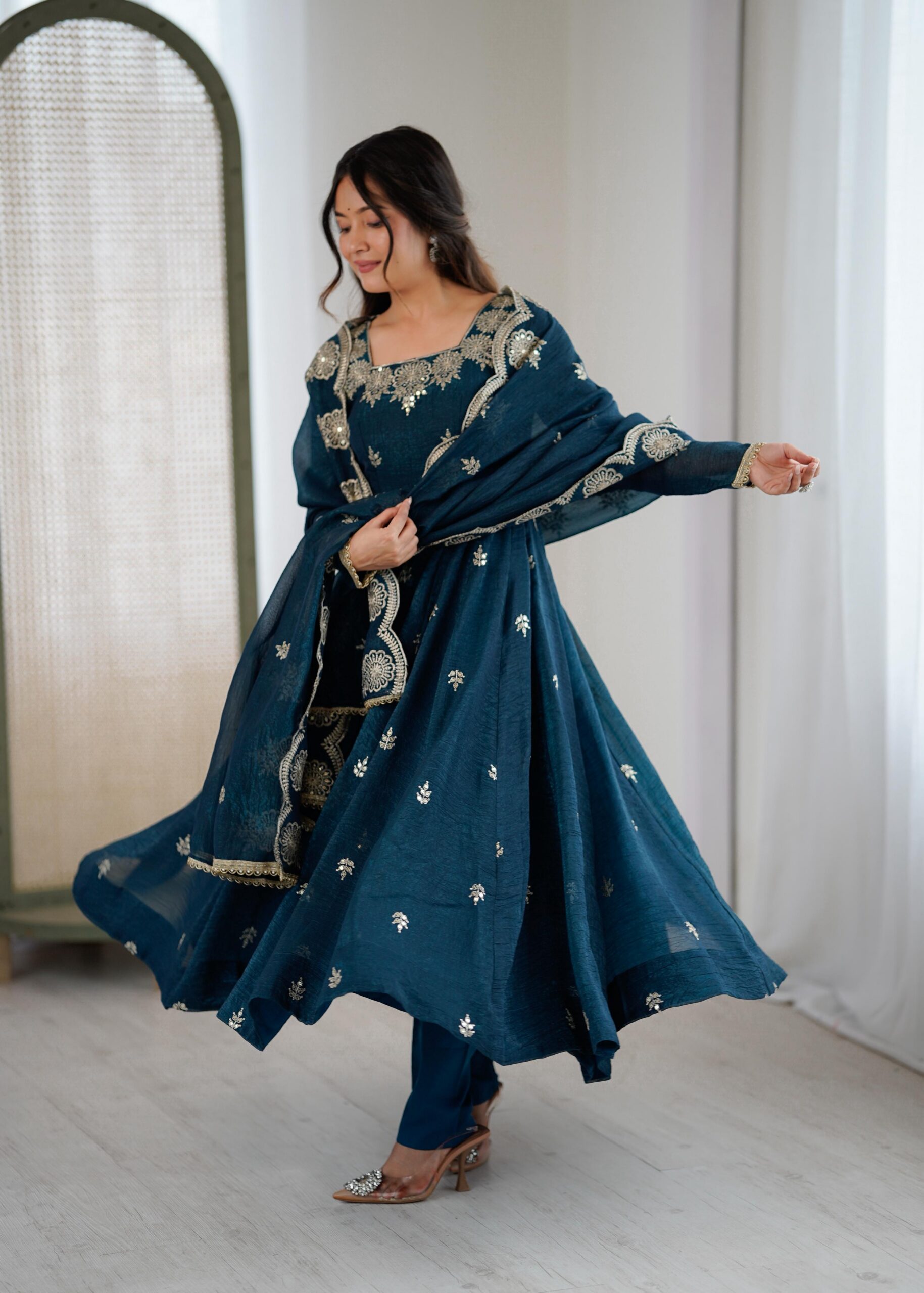 Teal Crunchy Silk Embroidery Work Gown