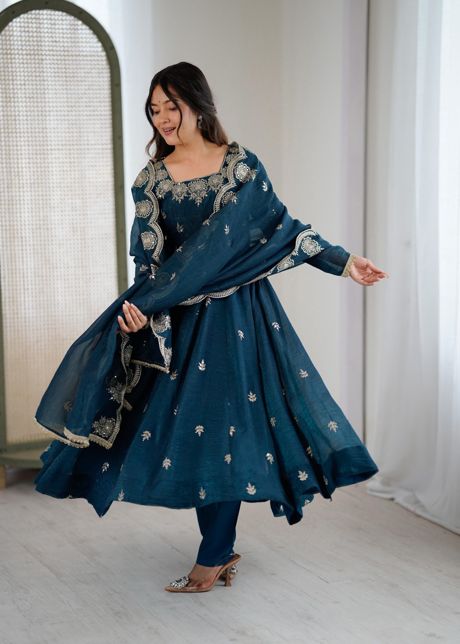 ZF 5011 Teal Crunchy Silk Gown with Embroidery Work. Wedding, Party, Festive, Events Best Price ₹2099. Delivery 4-6 Working Days. Shop now. | Gowns, Bollywood Gowns, Creative Gowns, Designer Gowns, Embroidered Gowns, Party Wear Gowns