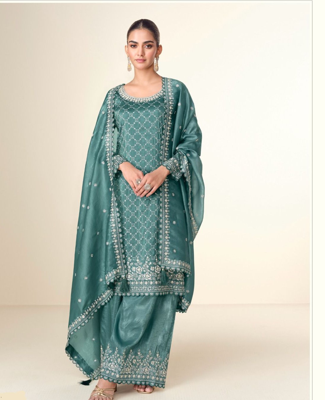 Teal Tissue Crush Embroidery Work Salwar Suit