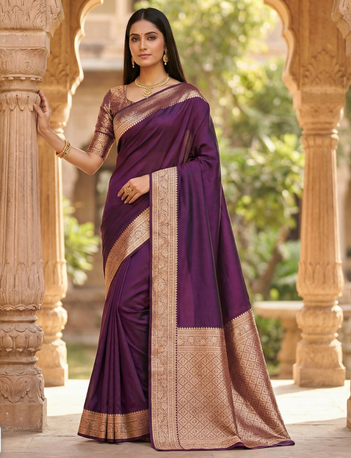 Saree :- rich looks, with heavy gold zari weaving. all-over floral jaal border, a paisley woven motif on the , and a richly crafted zari pallu
