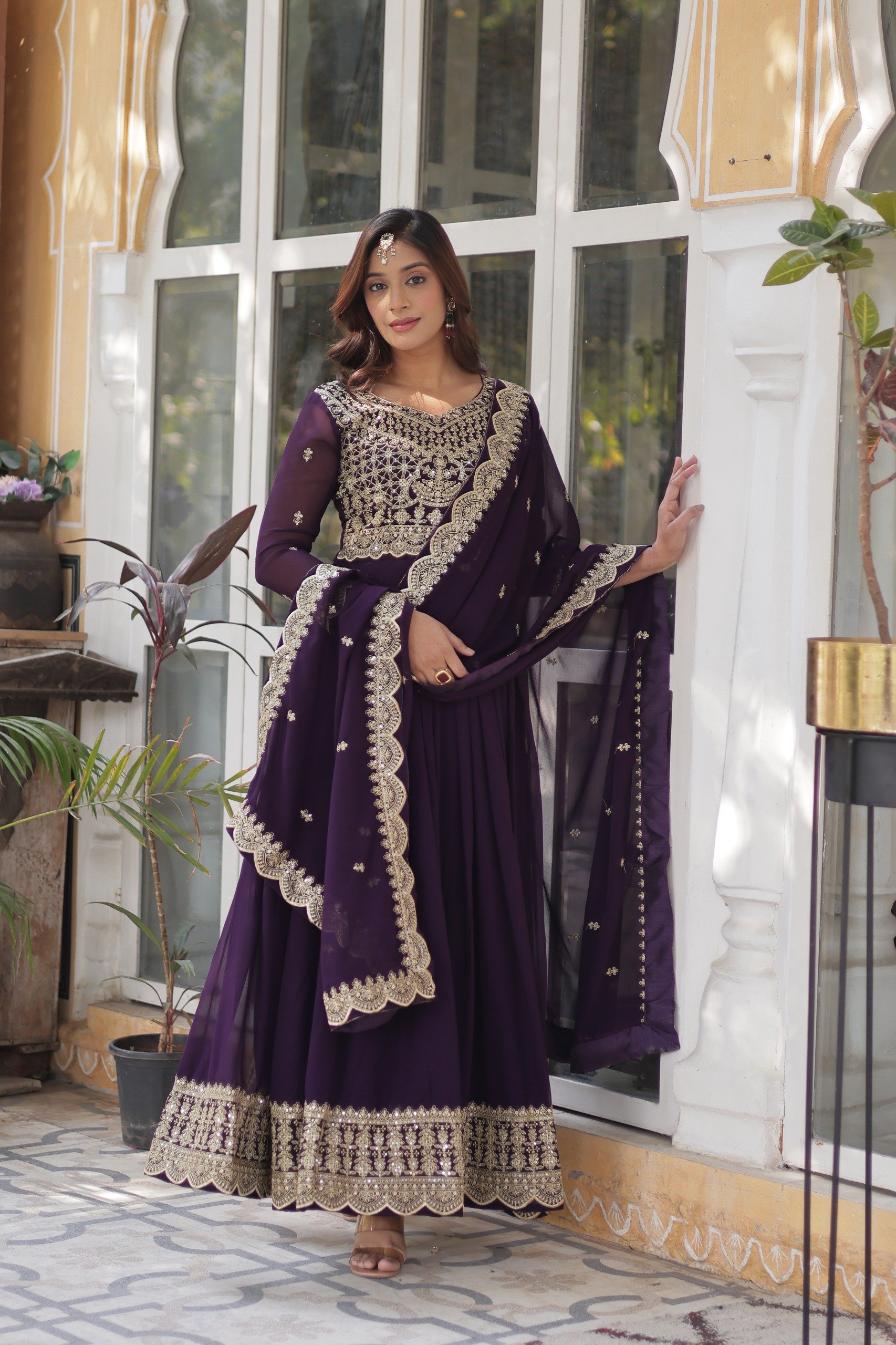 KA 1137 Wine Color Faux Blooming Gown with Embroidery Work & Zari Work. Best Price ₹2599. Delivery 4-6 Working Days. Shop now. | Gowns, Bollywood Gowns, Creative Gowns, Designer Gowns, Embroidered Gowns, Party Wear Gowns
