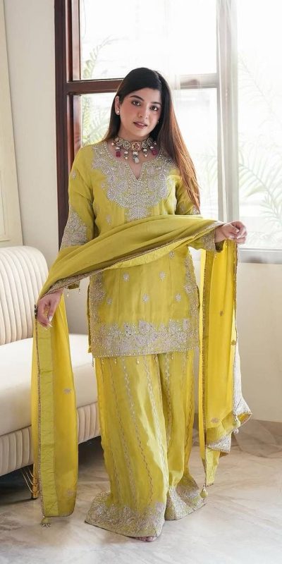 | Fabrics | Top Fabric : Heavy Chinon Silk With Heavy Embroidery Sequence Work with Rivet Moti Work*with Full Sleeve Top Inner : Heavy Micro Cotton Top Length : 38-39 Inch Top Size : Free Size Semi Stitched (Fully Stitched) (FULLY STITCHED READY TO WEAR)Gharara Fabrics : Heavy Chinon Silk With Heavy Embroidery Sequence Work with Rivet Moti Work* Gharara inner : Heavy Micro Cotton (Full stitched)Gharara Length:40-41 Inch (fully stitched) Dupatta Fabric : Heavy Chinon Silk With Heavy Embroidery Sequence Work and Lace Border |