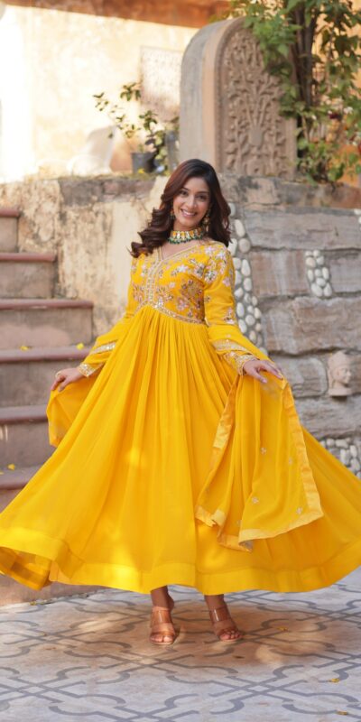 Yellow Faux Blooming Embroidery Zari Work Gown