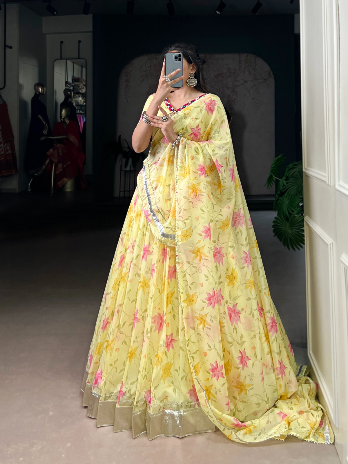 “The lehenga choli’s skirt is adorned with intricate gota patti work, adding a traditional touch that’s reminiscent of Indian heritage.”